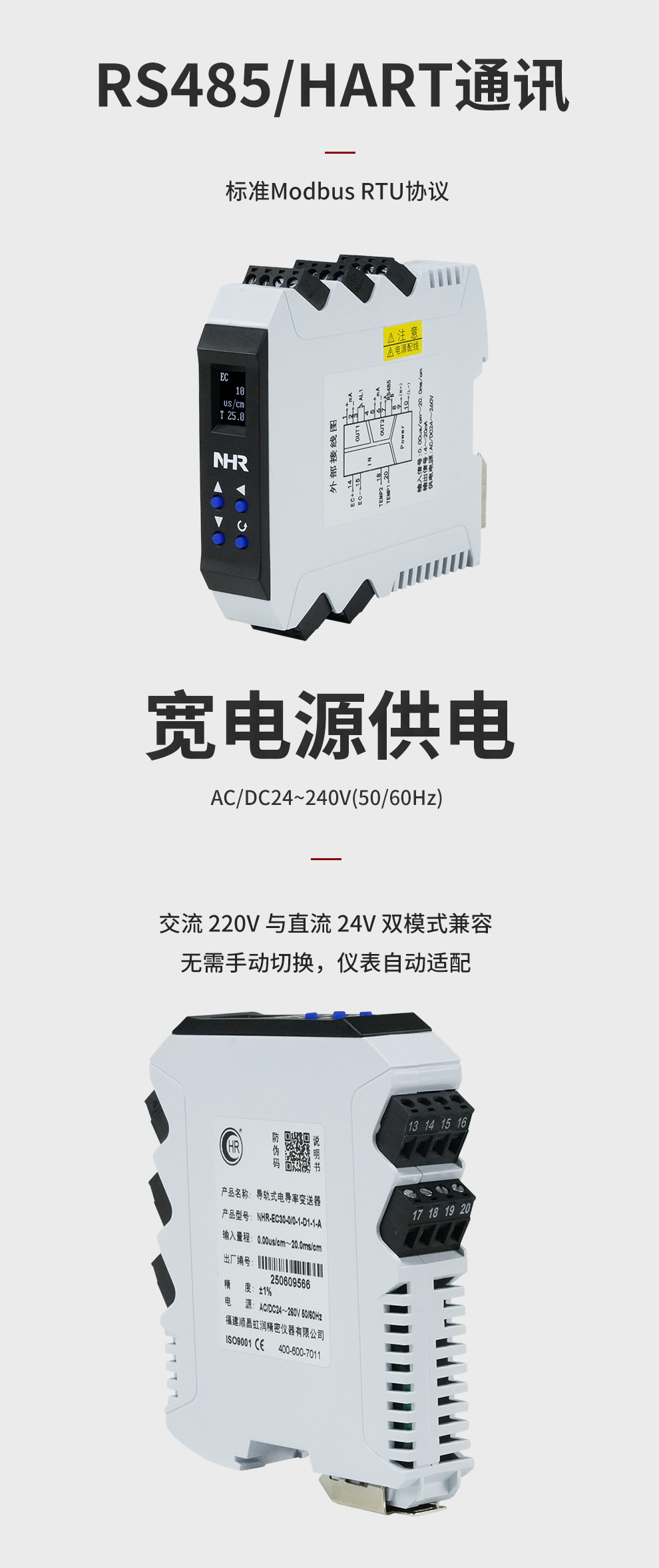 虹潤公司是專業(yè)生產(chǎn)水質(zhì)分析儀的國家專精特新“小巨人”企業(yè)。生產(chǎn)的導(dǎo)軌式電導(dǎo)率變送器,具有測(cè)量穩(wěn)定不跳字,液晶顯示按鍵操控,變送輸出精準(zhǔn),寬范圍電源供電,RS485或HART通訊等特點(diǎn)。產(chǎn)品獲得一種信號(hào)發(fā)生裝置、智能化控制器等2項(xiàng)國家發(fā)明專利;主持起草現(xiàn)場(chǎng)設(shè)備集成等5項(xiàng)智能制造國家標(biāo)準(zhǔn),以及現(xiàn)場(chǎng)設(shè)備工具(FDT)接口規(guī)范、工業(yè)過程控制系統(tǒng)用模擬輸入兩位或多位輸出儀表、過程分析技術(shù)系統(tǒng)等3項(xiàng)國家標(biāo)準(zhǔn);參與國際5G標(biāo)準(zhǔn)制定,取得導(dǎo)軌電導(dǎo)率變送器等3項(xiàng)相關(guān)軟件著作權(quán)。產(chǎn)品廣泛應(yīng)用于實(shí)驗(yàn)室、水處理、環(huán)境監(jiān)測(cè)、制藥、食品、農(nóng)業(yè)、工業(yè)流程控制等諸多領(lǐng)域。
