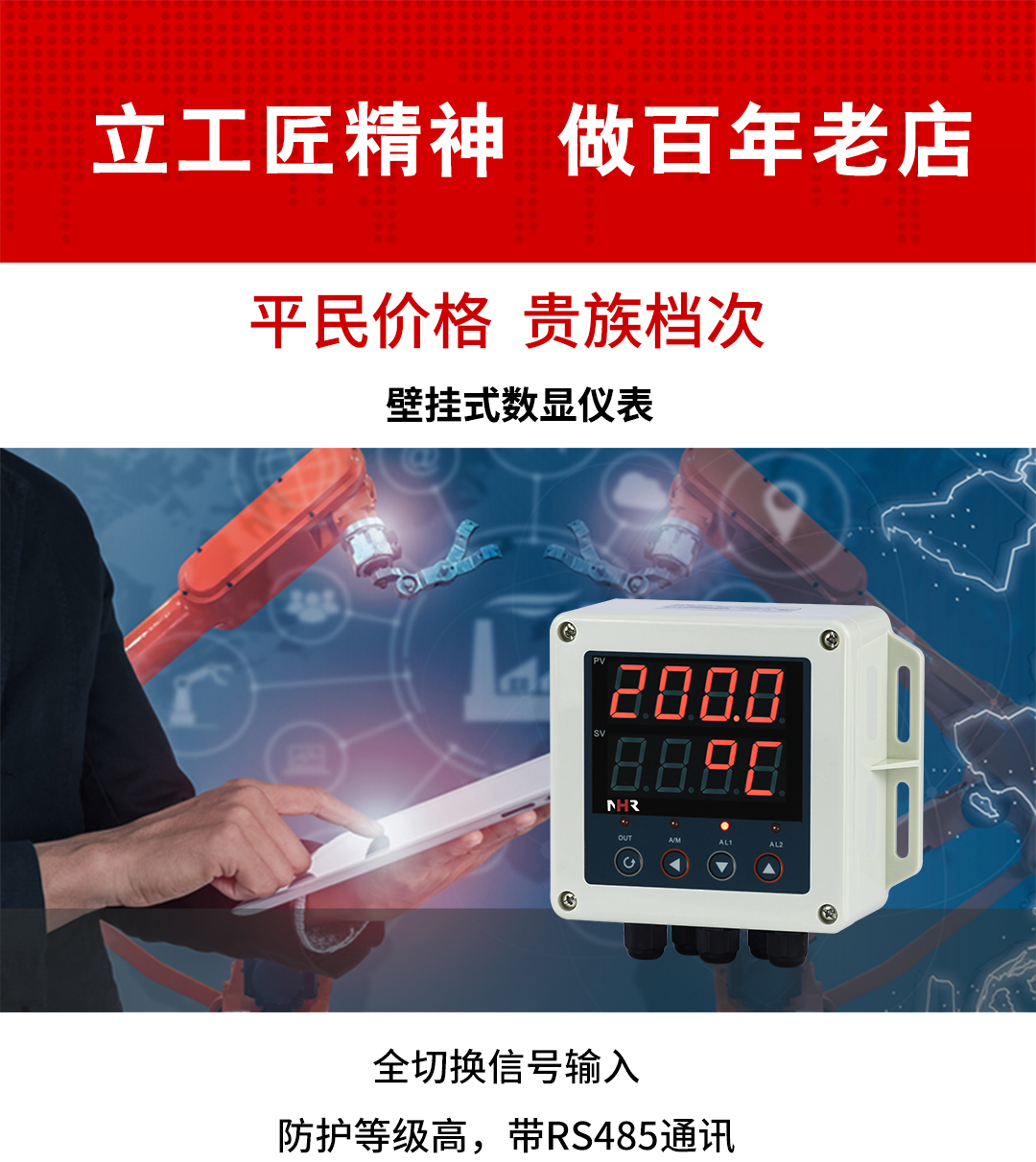 虹潤公司是專業(yè)生產(chǎn)數(shù)顯表的國家專精特新“小巨人”企業(yè),生產(chǎn)的壁掛式數(shù)顯儀表,具有全切換信號輸入,高抗干擾,IP65防護等級,全隔離設計,變送輸出或RS485通訊等特點。產(chǎn)品獲得巡回檢測顯示方法及裝置、工業(yè)模塊的導軌式安裝結構等2項國家發(fā)明專利,主持起草工業(yè)過程控制系統(tǒng)用模擬輸入兩位或多位輸出儀表、物聯(lián)網(wǎng)智能溫度儀表通用技術條件等2項國家標準,,以及通信系統(tǒng)多通道數(shù)據(jù)采集控制終端規(guī)范軍用標準,參與國際5G標準制定,取得簡易數(shù)顯儀表等3項相關軟件著作權。產(chǎn)品廣泛應用于電力、石化、冶金、化工、造紙、食品、輕工、制藥、熱處理、水處理、機械配套等各種工業(yè)現(xiàn)場。
