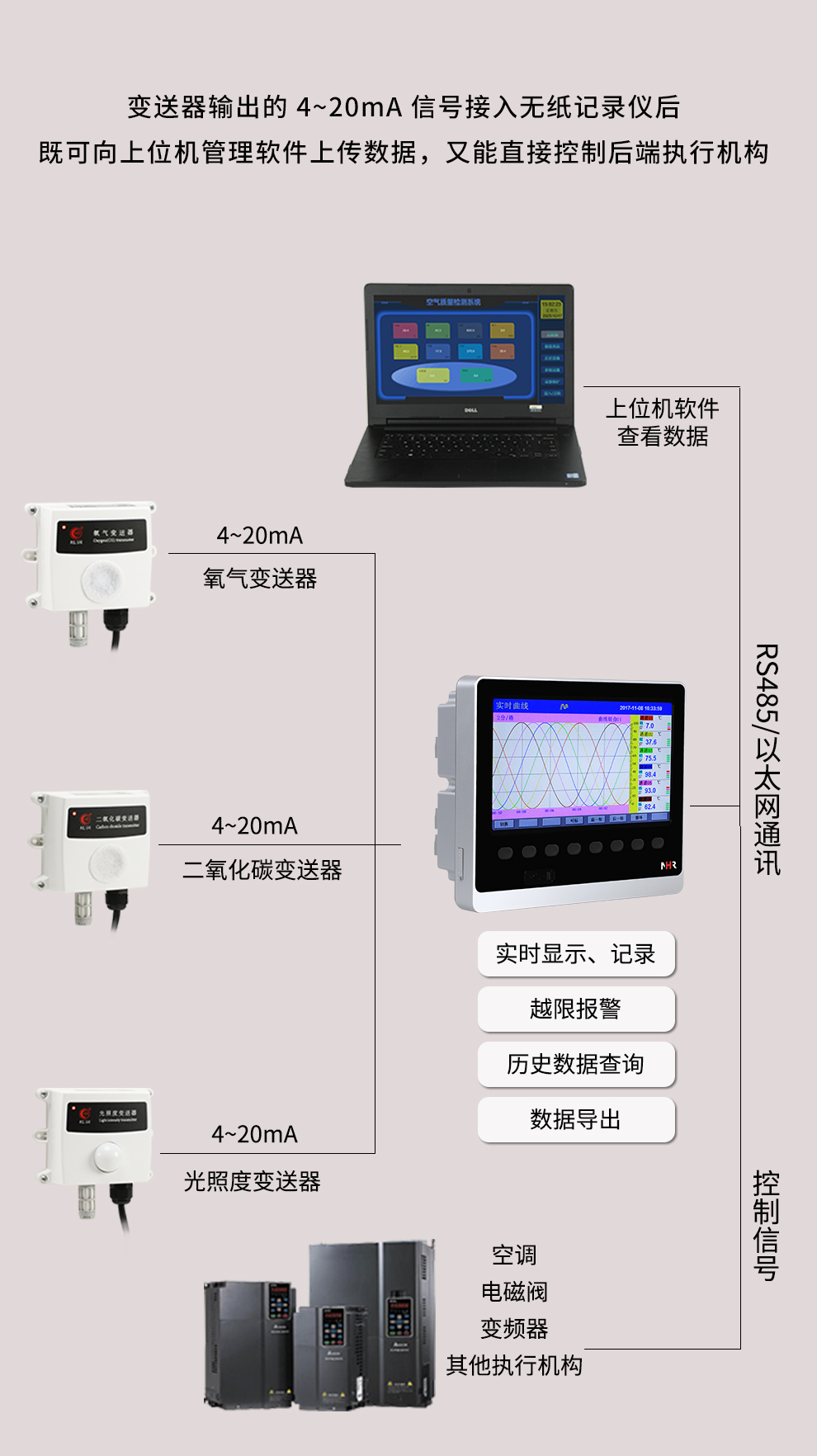 | 環(huán)境監(jiān)測儀 | 大屏溫濕度記錄儀 溫濕度儀表 環(huán)境參數(shù)變送器 直插式土壤傳感器 |