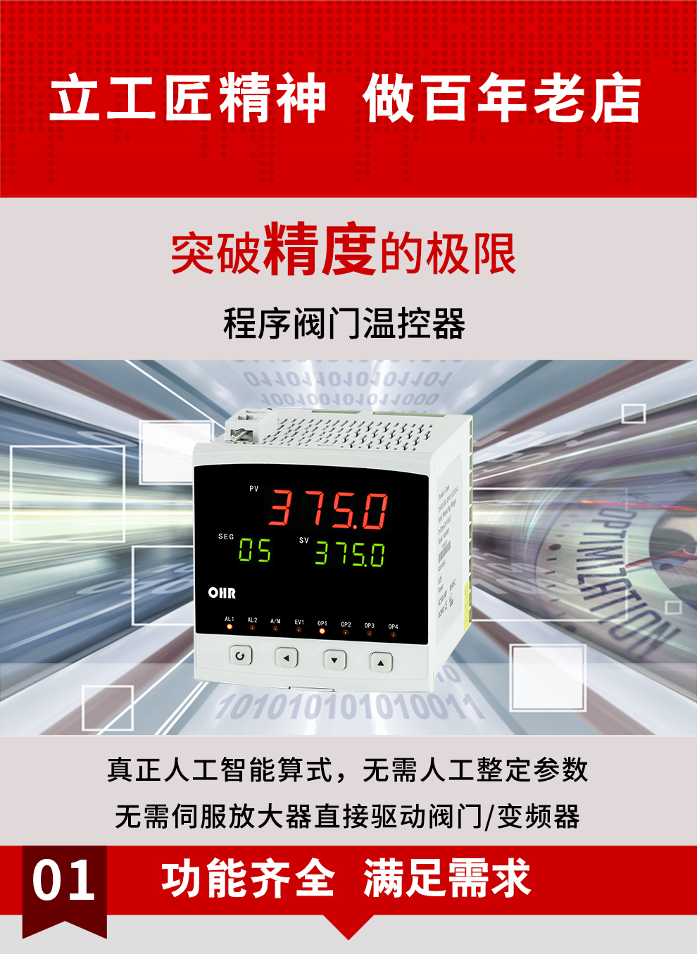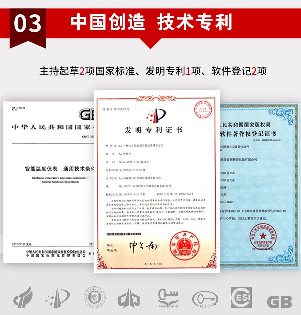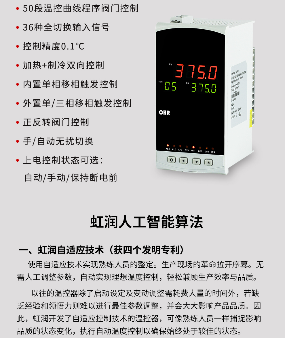 虹潤公司是專業(yè)生產(chǎn)溫控器的國家專精特新“小巨人”企業(yè)。生產(chǎn)的程序閥門溫控器,具有50段溫控程序控制,真正人工智能算式,無需人工整定參數(shù),控制精度可達±0.1°C,加熱制冷雙向控制等特點。產(chǎn)品獲得模糊PID控制儀及控制方法、人工智能調(diào)節(jié)器、智能化控制器、移相觸發(fā)控制器、閥門自動手動無擾動操作控制方法及裝置等5項國家發(fā)明專利,主持起草智能溫度儀表通用技術(shù)條件、工業(yè)過程控制系統(tǒng)用模擬輸入兩位或多位輸出儀表、工業(yè)過程測量和控制系統(tǒng)用智能調(diào)節(jié)器等3項國家標(biāo)準(zhǔn),,以及通信系統(tǒng)多通道數(shù)據(jù)采集控制終端規(guī)范軍用標(biāo)準(zhǔn),參與國際5G標(biāo)準(zhǔn)制定,取得增強型分段調(diào)節(jié)器等3項相關(guān)軟件著作權(quán)。產(chǎn)品廣泛應(yīng)用于電力、石化,冶金、制藥、食品等幾乎所有工業(yè)現(xiàn)場,實現(xiàn)精準(zhǔn)控溫,保障生產(chǎn)安全與質(zhì)量。