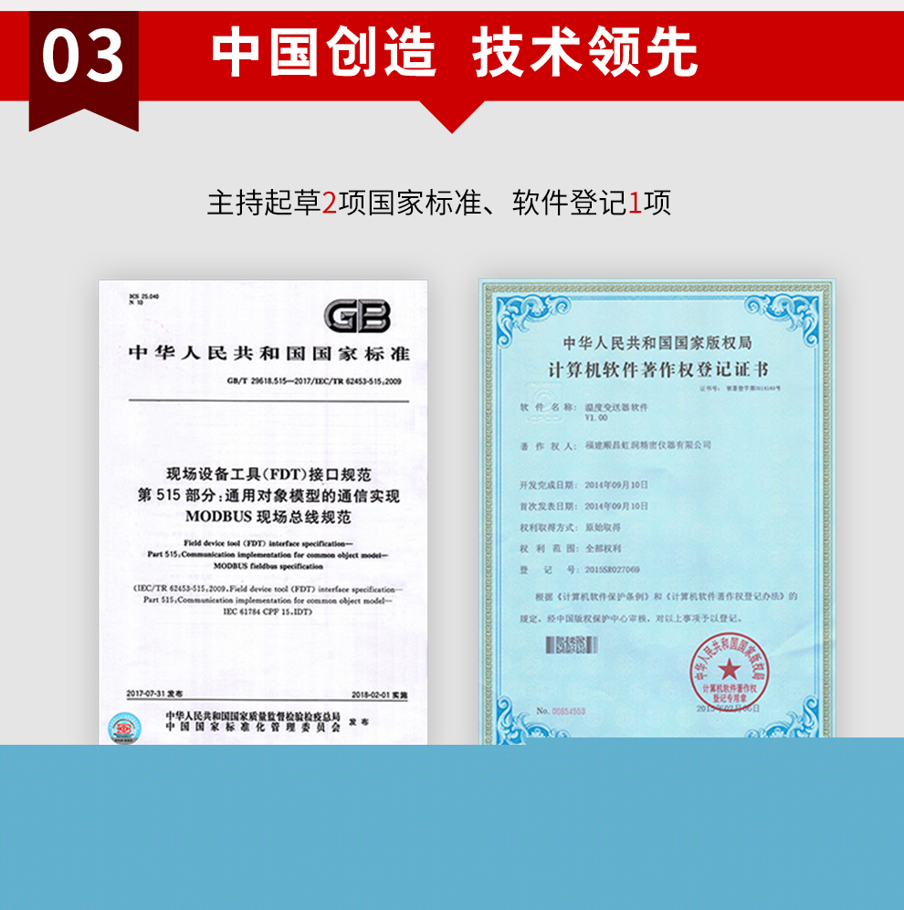 虹潤(rùn)公司是專業(yè)生產(chǎn)溫度變送器的國(guó)家專精特新“小巨人”企業(yè)。生產(chǎn)的現(xiàn)場(chǎng)顯示隔離溫度變送器,具有可修改輸入信號(hào)類型,測(cè)量精度高,穩(wěn)定性好,帶HART或RS485通訊計(jì)等特點(diǎn)。該產(chǎn)品不僅通過德國(guó)萊茵 CE 認(rèn)證與 SIL 功能安全認(rèn)證,還獲得具備減震抗干擾能力的溫度變送器、信號(hào)隔離器、一種二端子模塊、無源信號(hào)隔離器等3項(xiàng)國(guó)家發(fā)明專利。主持起草物聯(lián)網(wǎng)智能溫度儀表、現(xiàn)場(chǎng)設(shè)備工具(FDT)接口規(guī)范、工業(yè)過程測(cè)量和控制系統(tǒng)用溫度變送器等3項(xiàng)國(guó)家標(biāo)準(zhǔn),以及通信系統(tǒng)多通道數(shù)據(jù)采集控制終端規(guī)范軍用標(biāo)準(zhǔn)。參與國(guó)際5G標(biāo)準(zhǔn)制定,取得高精度溫度變送器等3項(xiàng)相關(guān)軟件著作權(quán)。產(chǎn)品廣泛應(yīng)用于石油、化工、電力、冶金、制藥、食品、水處理等各種工業(yè)領(lǐng)域。
